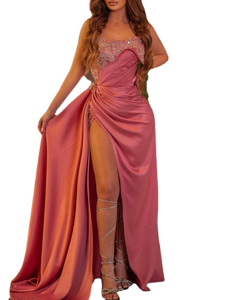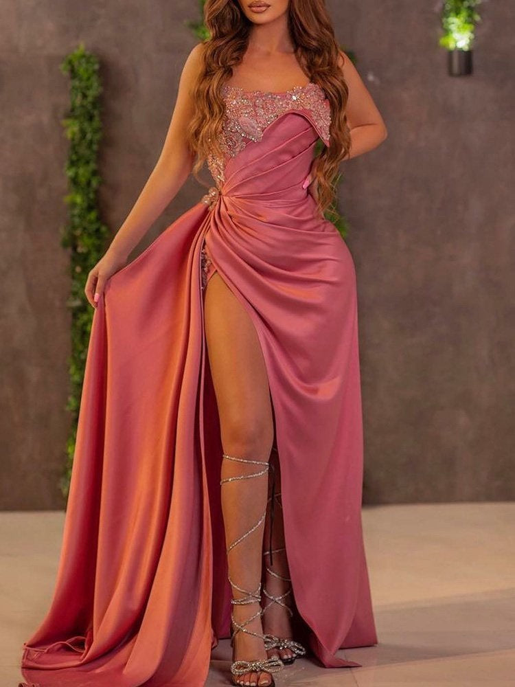تبدو جميلة بغض النظر عن ما في الليلة عندما ترتدي فستان Maxi الطويل للسيدات مع نسيج حريري يتدفق وخط العنق المرصع بالجواهر الذي يضم تنحنحًا طويلًا وشق الفخذ العالي. إنه يأتي في اللون الوردي المترب المبرق.