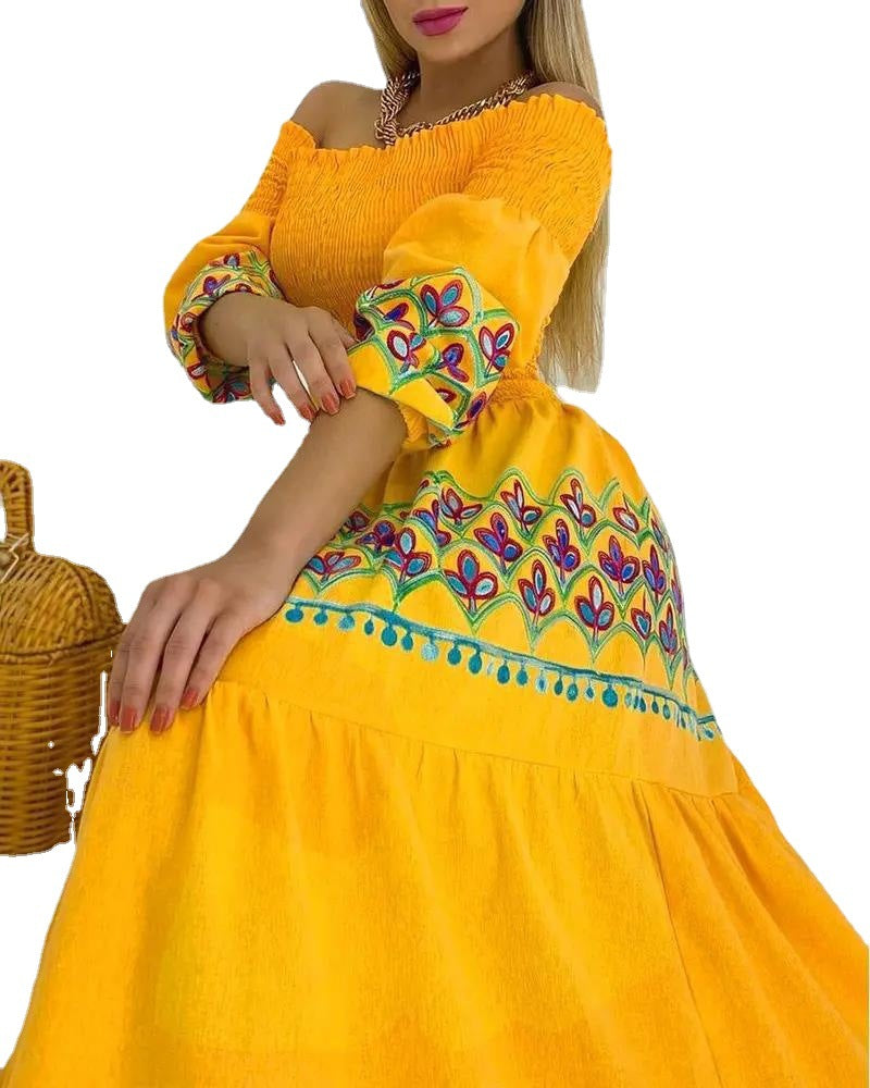 Catch the eye of everyone in the room wearing this one of a kind Women's Mexican Style Vibrant Gown with Three Quarter Length Sleeves. It features botanical decorations around the hem, thighs and sleeves.