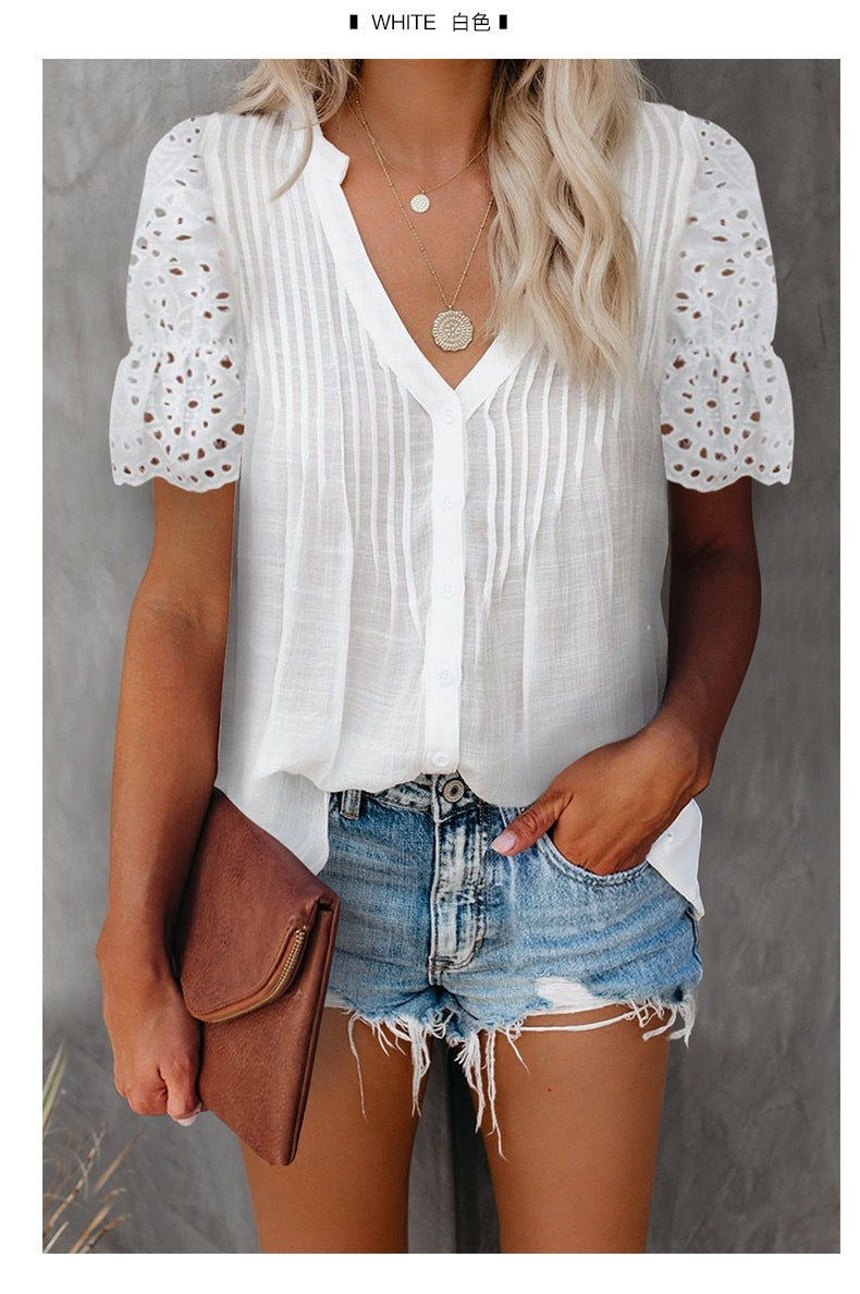 A combination of lightweight semi sheer material and lacy sleevesmakes this Lacy Short Sleeve Semi-Sheer Women's Casual Blouse a chic and cute choice.It comes in several colors to suit any taste.