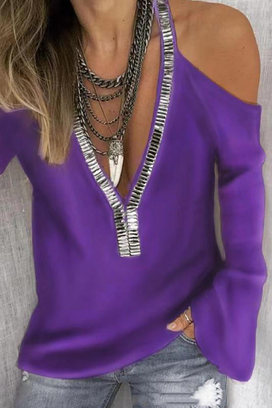 Characterized by the shining V-neck and straps, the Metallic Sequin Lined Low V-Neck Cold Shoulder Top is an eye-catching top comfortable and cool enough for wear during the summer thanks to its cold shoulder design.