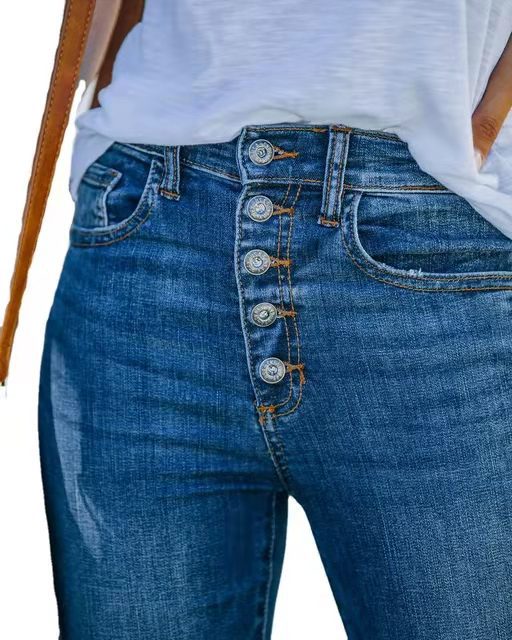 Kehren Sie zu den Stilen vergangener Zeiten zurück, wenn Sie das Women's Wide Flair Leg with Ripped Knees tragen. Entlang der Vorderseite dieser Jeans befinden sich fünf vertikale Knöpfe, die dem Look einige Details verleihen.