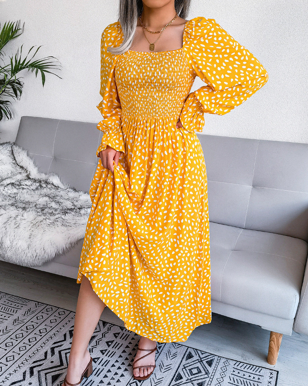 Fließend, farbenfroh und freigeistig ist dieses langärmlige Maxikleid für Damen mit Polka Dots perfekt für den Frühling. Das Kleid besteht aus leichten Materialien, die luftig und atmungsaktiv sind.