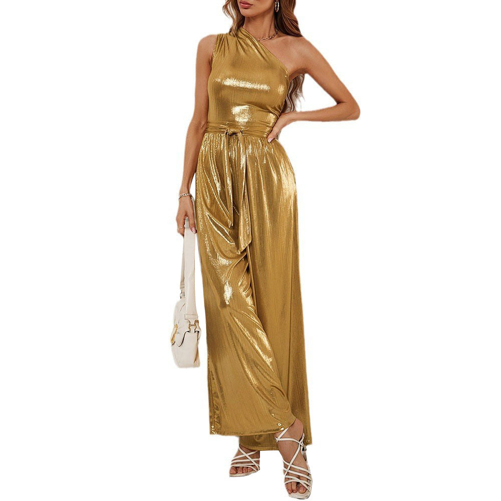 Stand out in any environment wearing the Women's Cold Shoulder Shimmering Pantsuit with Bow Tie Waist. The golden color gives it an opulent appearance.