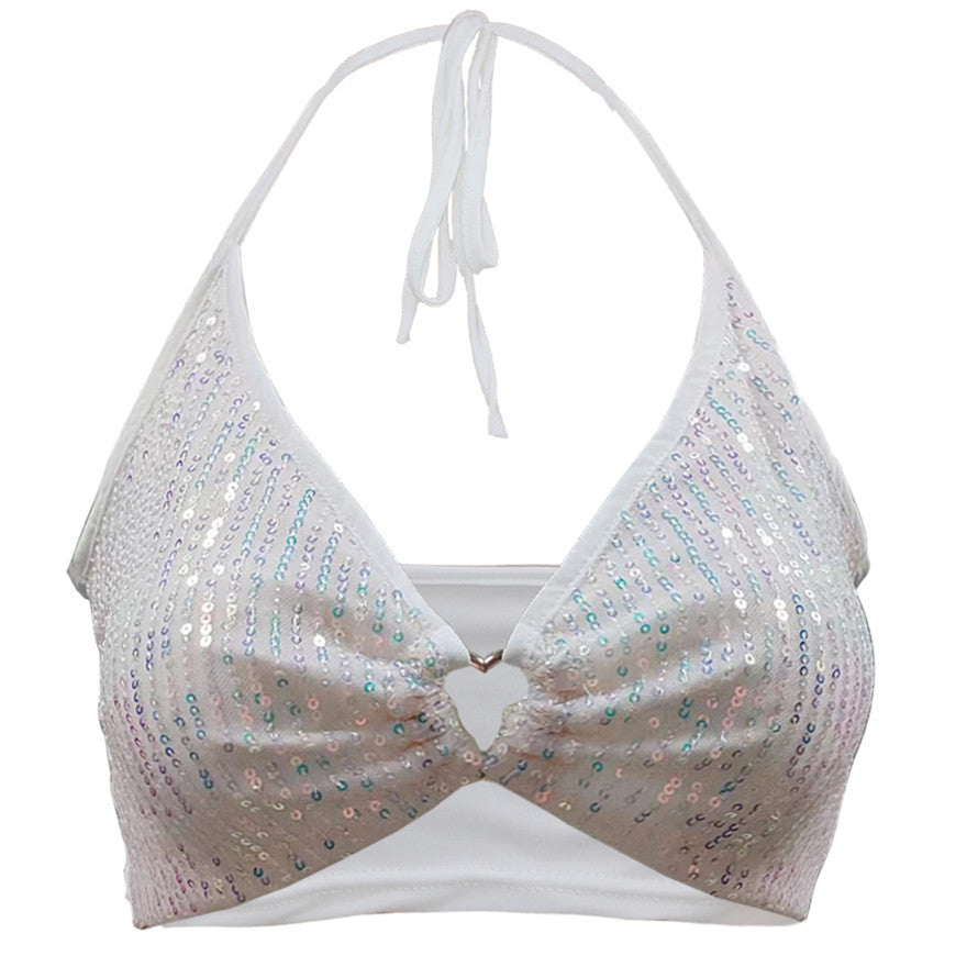Con el top de lentejuelas de las mujeres con cuello en V, puedes verte lindo en cualquier día de playa. Viene en blanco o negro y presenta un recorte de corazón en el centro.