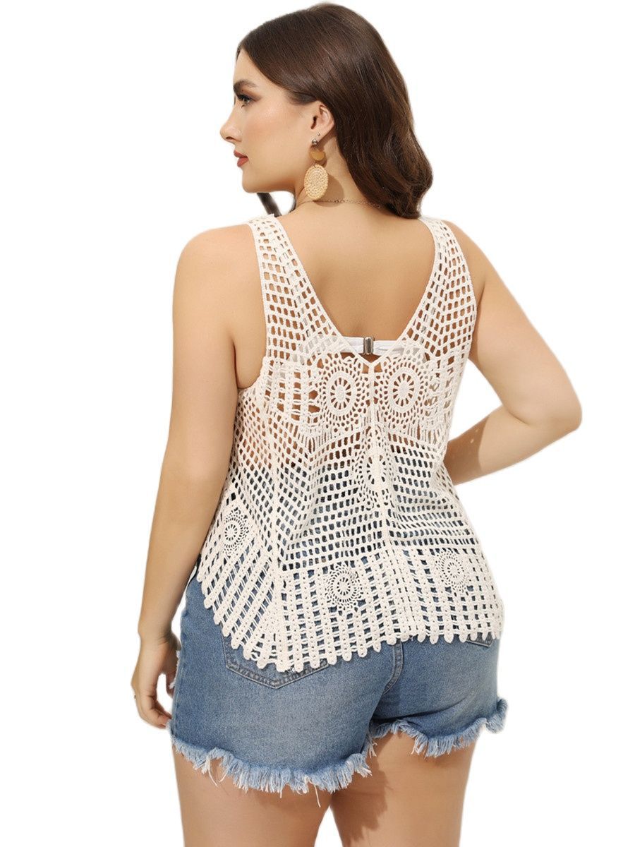 Este top estampado de encaje de malla de malla de mujeres para mujeres es una opción transpirable y linda para los días de playa y más allá. Viene en un tono blanco crema halagador.