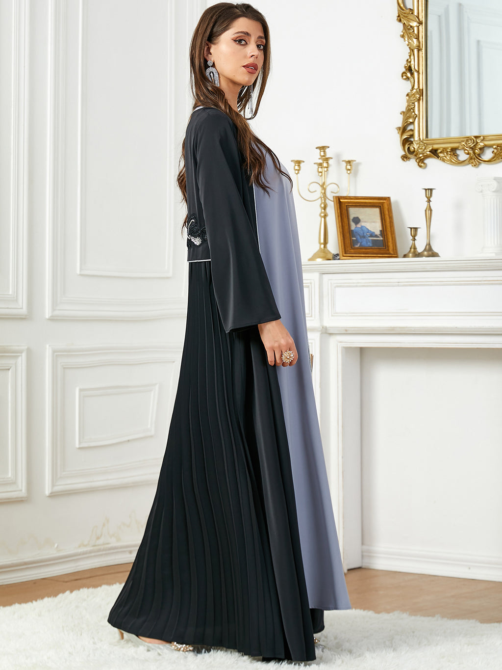 Add a sophisticated touch with the Women's Long Sleeve Flowy Maxi Dress with Botanical Details. This midnight blue and silver dress is simple yet chic.