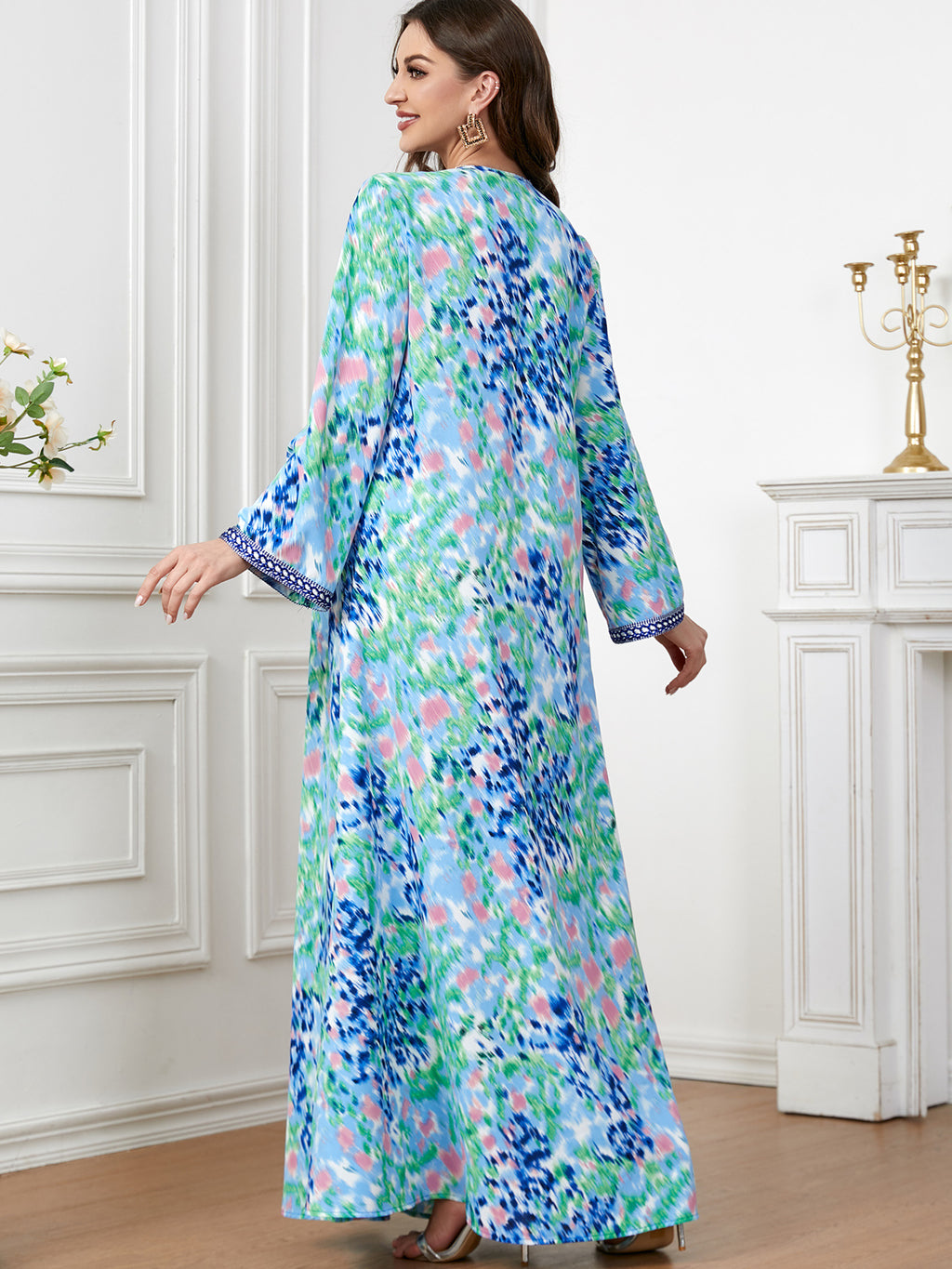 Express your vibrant personality wearing the Women's Long Sleeve Tie-Dye Style Maxi Dress featuring navy blue and white braided details along the front.