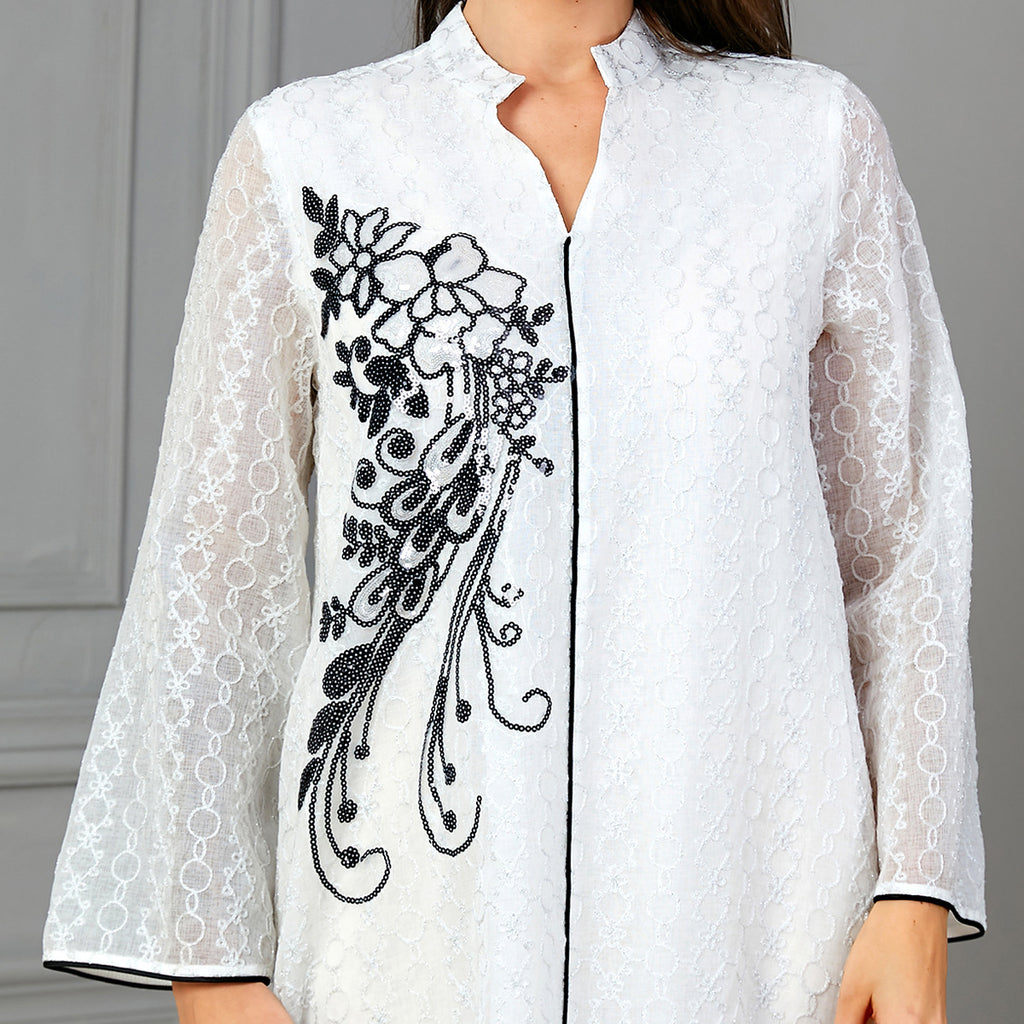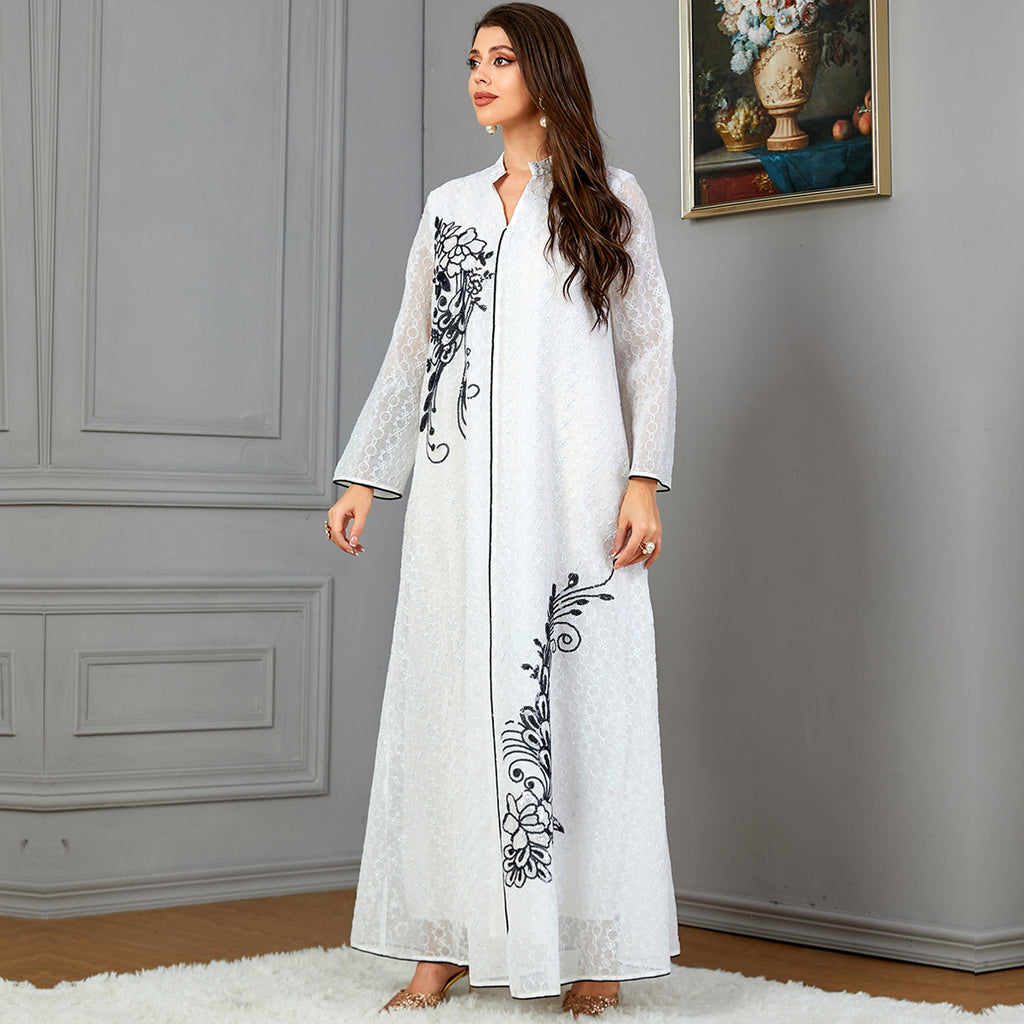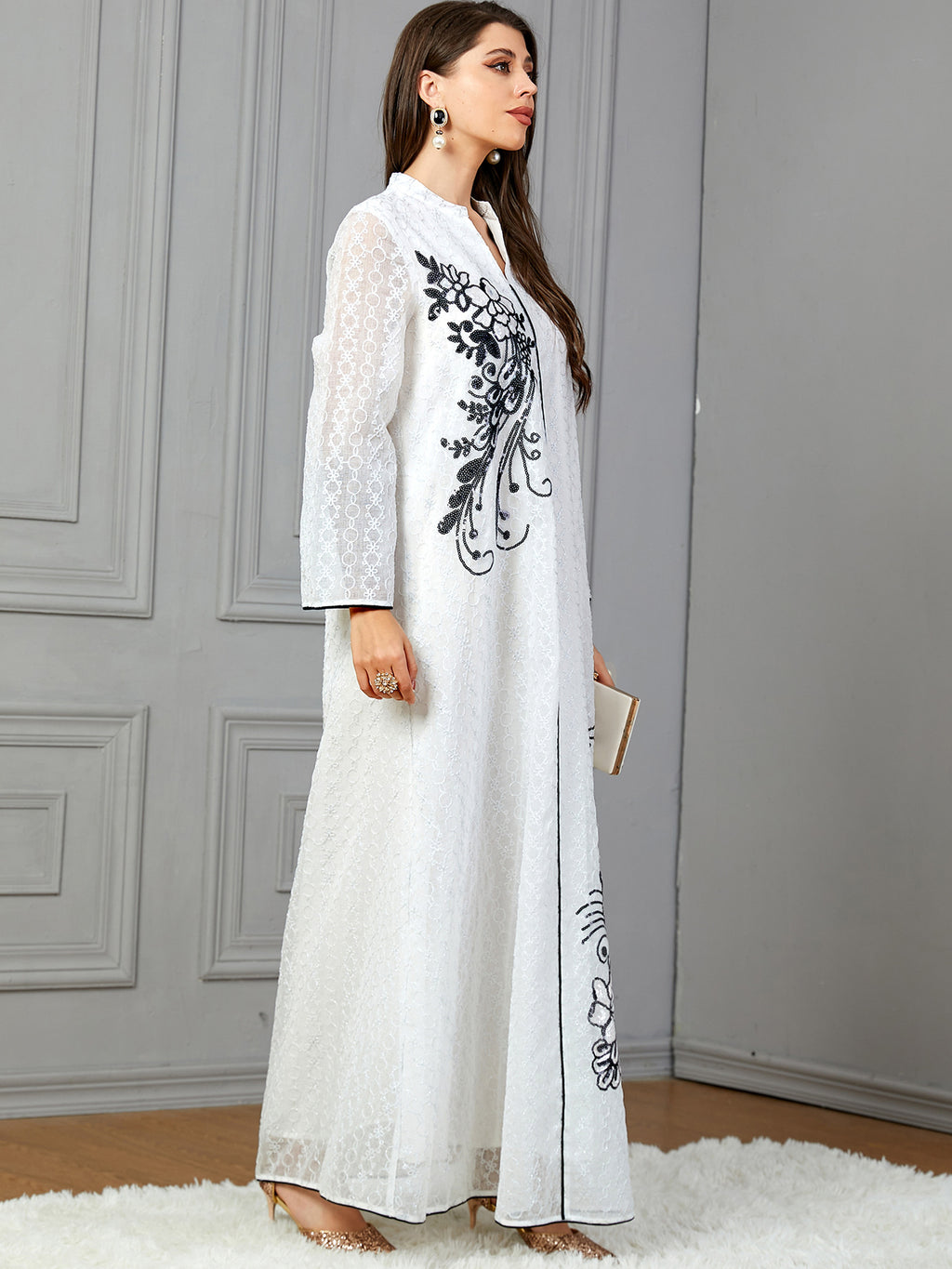 Keep it simple and clean in the Women's Long Sleeve White Mock Neck Maxi Dress that features black, swirling floral details near the bodice and skirt.