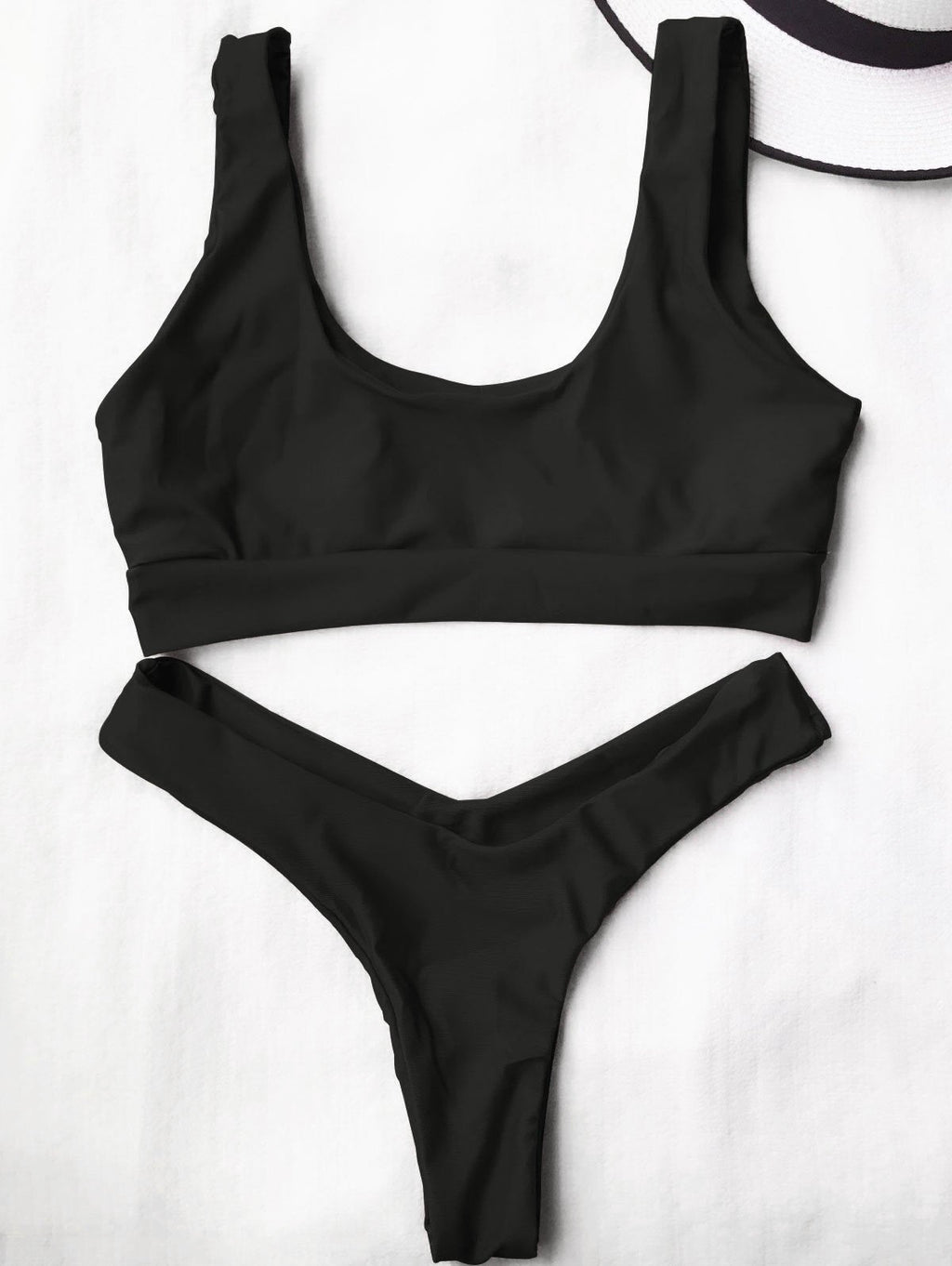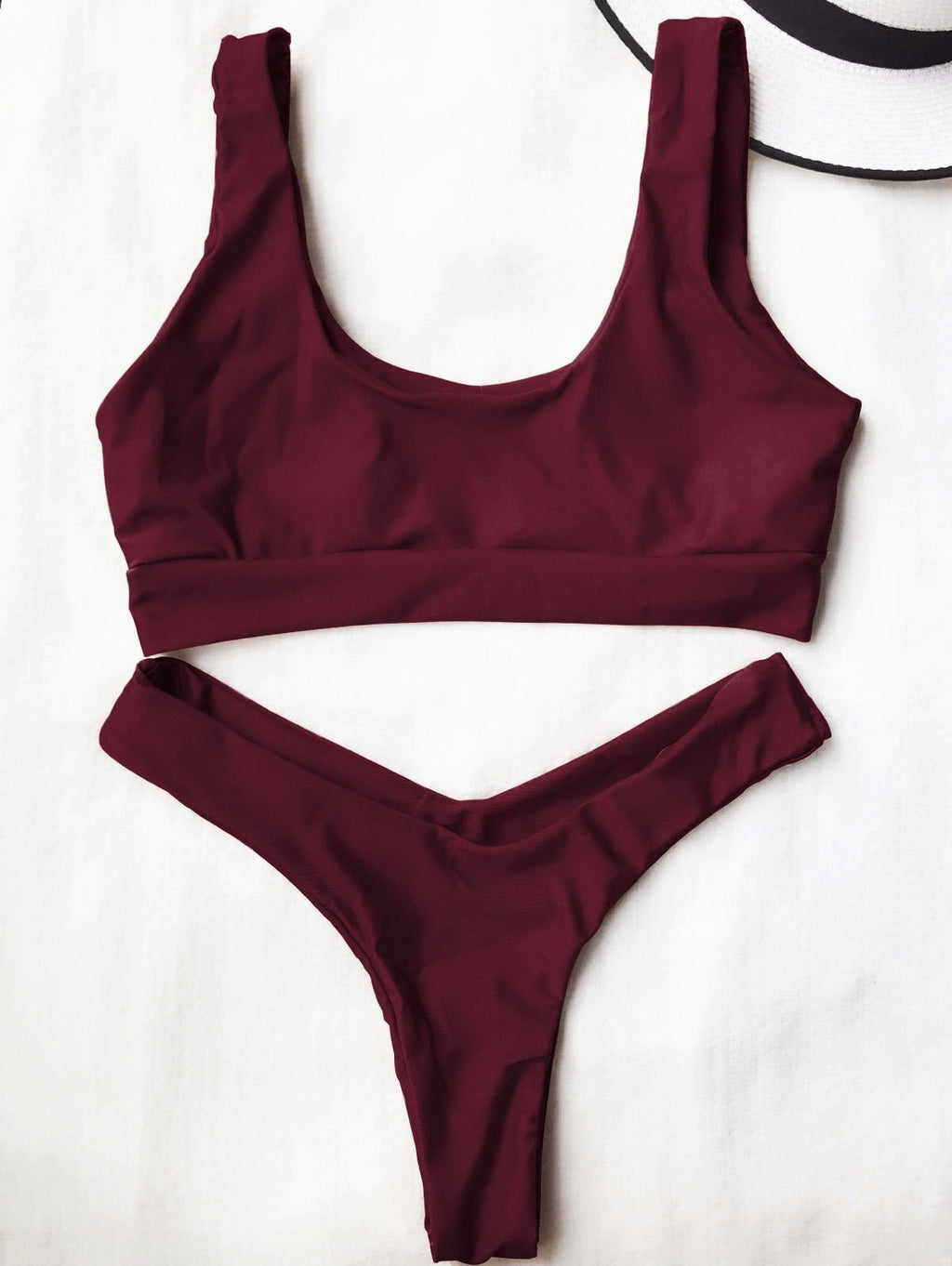 Ce maillot de bain de bralette se compose d'un crop top à bikini rembourré à cou et d'un bas de string haut de coupe, le tout de couleur unie. Vêtements de plage idéaux pour les vacances d'été sur la plage.
