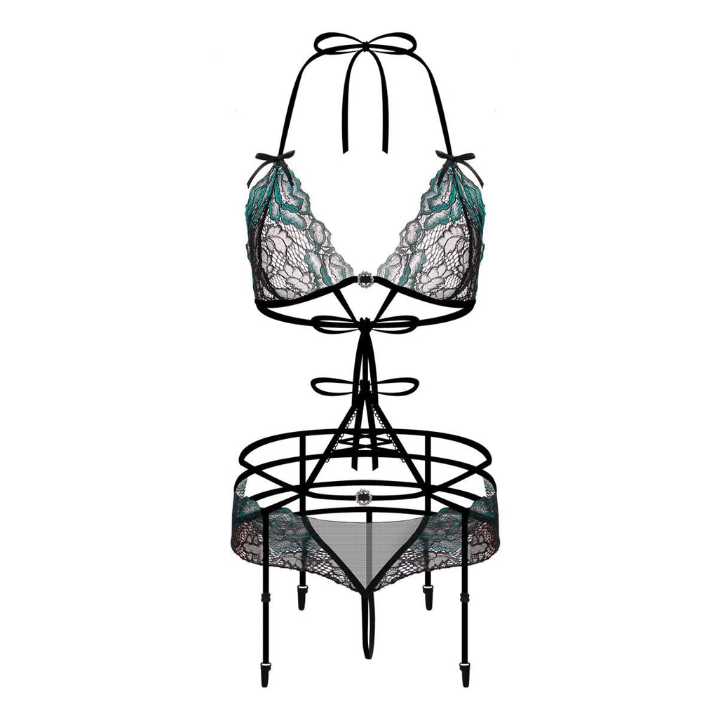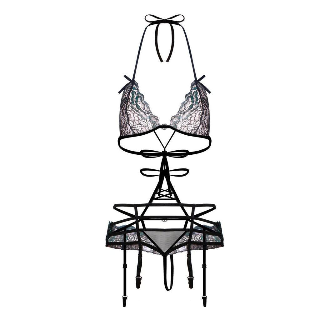 De votre buste à vos hanches, jusqu'à vos cuisses, l'ensemble de lingerie à la garine en dentelle à cage accentuera chaque courbe de votre corps.