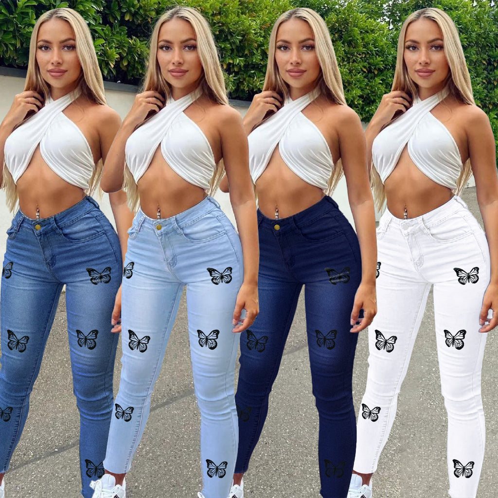 Parfait pour le printemps, ces jeans en denim maigres des femmes avec des graphiques papillon donnent vie à tous vos ensembles. Ils sont disponibles en blanc ou noir avec des détails papillon sur les cuisses et les tibias.