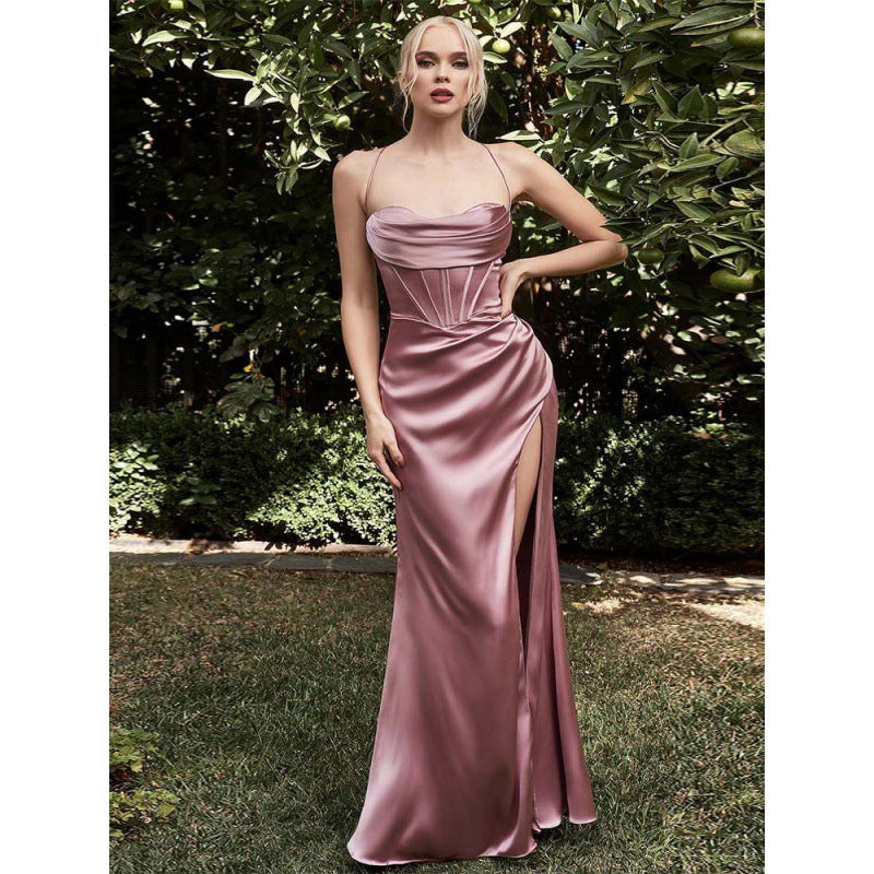 Complétez votre garde-robe nocturne avec cette robe maxi soyeuse et élégante et élégante avec un décolleté en cœur et une fente de cuisse. Il est disponible en plusieurs options de couleurs chics.