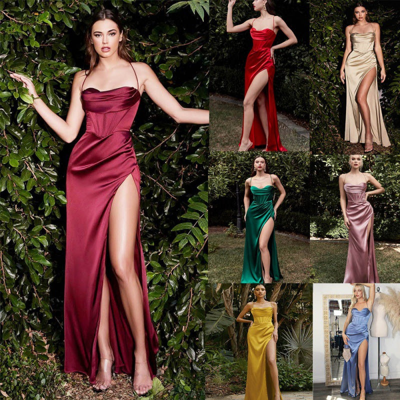 Robe maxi soyeuse aux femmes avec décolleté en cœur et fente de cuisse