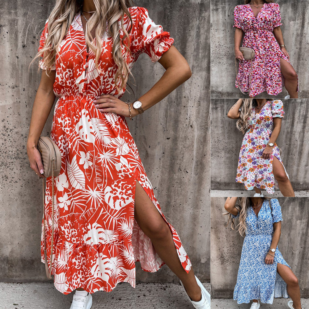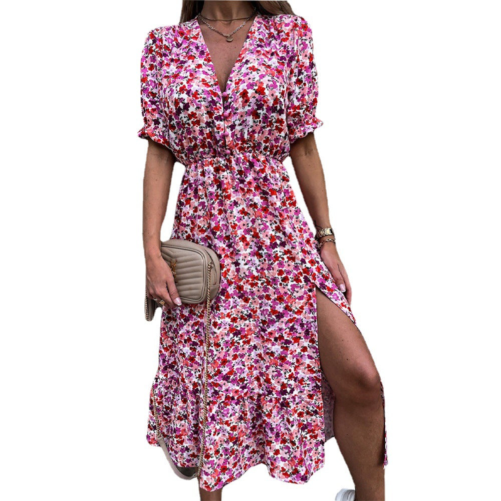 इस भाग को देखो इस वसंत में महिलाओं की छोटी आस्तीन की कमर वी-नेक मिडी ड्रेस पहने हुए। यह रंगीन पोशाक इसके पुष्प प्रिंट और जीवंत रंग विकल्पों की विशेषता है।