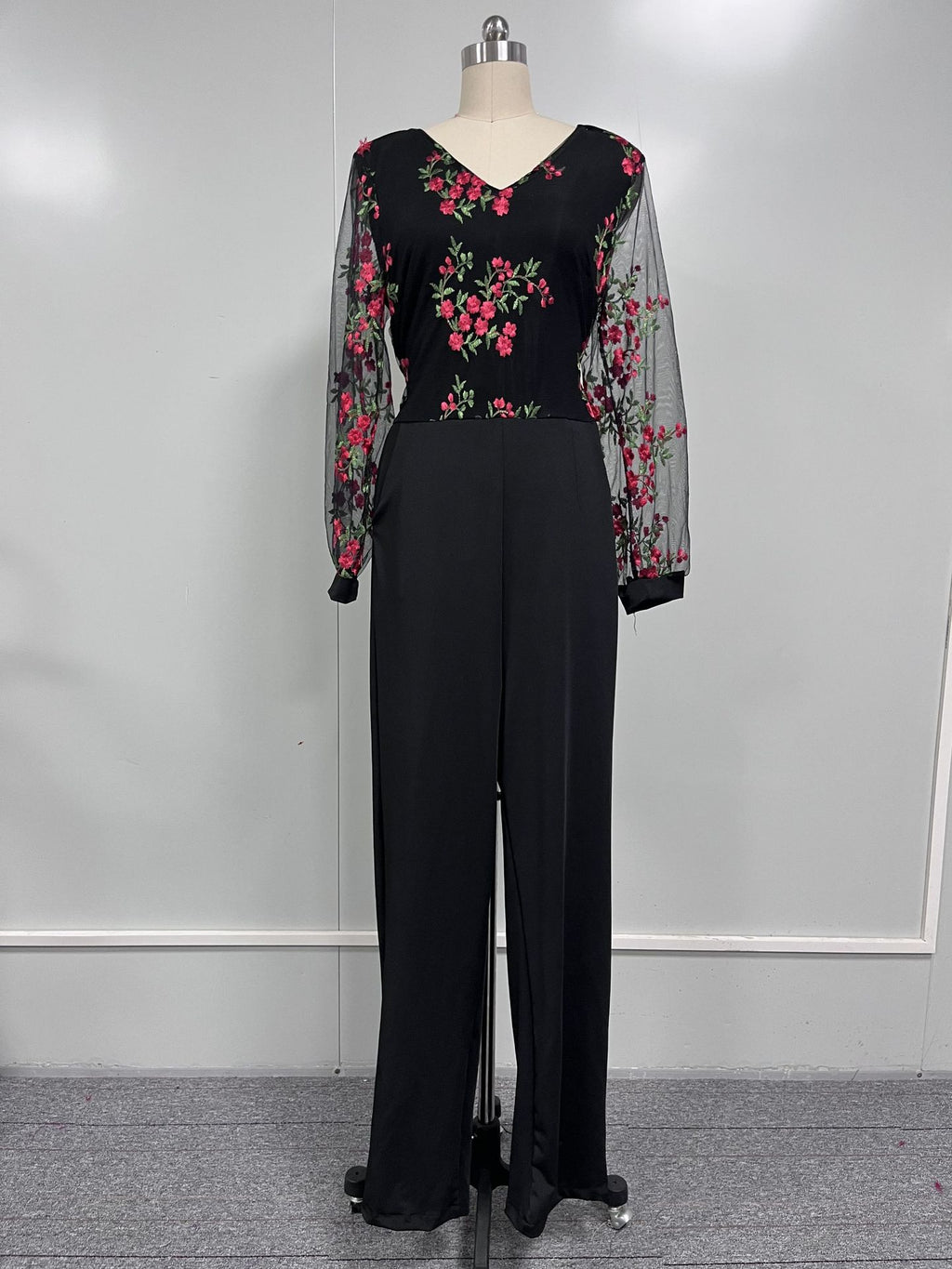 Terlihat canggih dan profesional di jumpsuit merah dan hitam berbunga wanita dengan v-neck dan celana kaki lebar. Pakaian serbaguna ini sebagian besar berwarna hitam dengan muncul detail bunga merah di sepanjang korset dan lengan panjang.