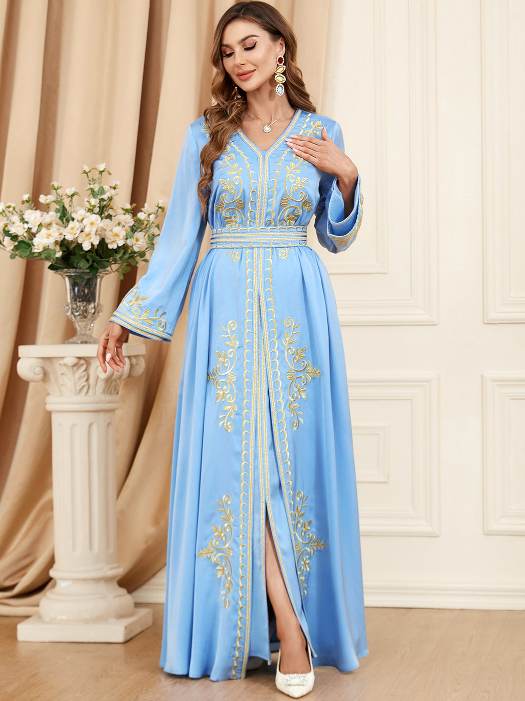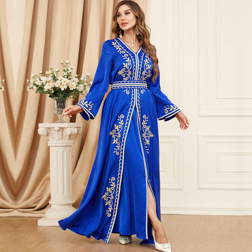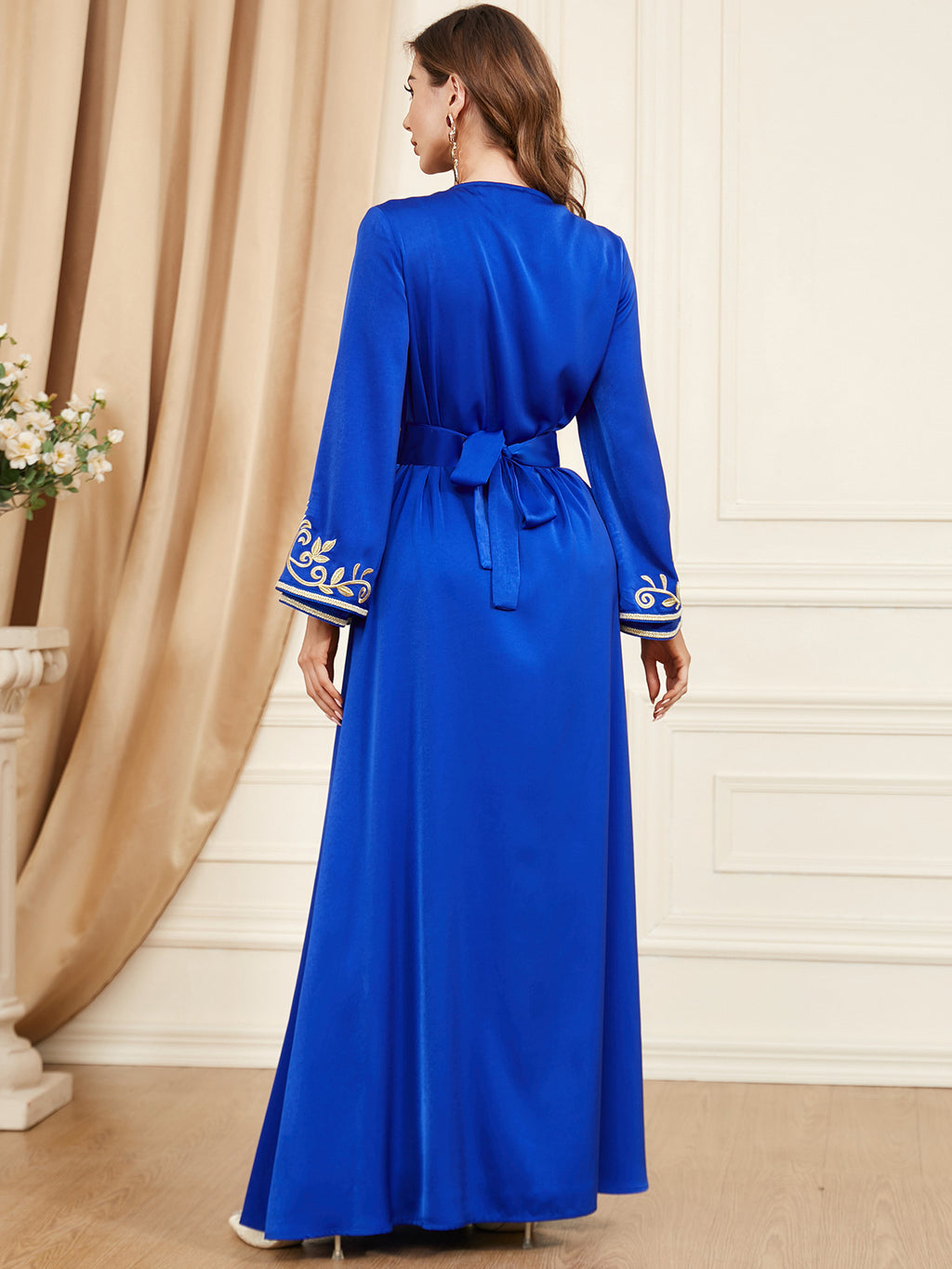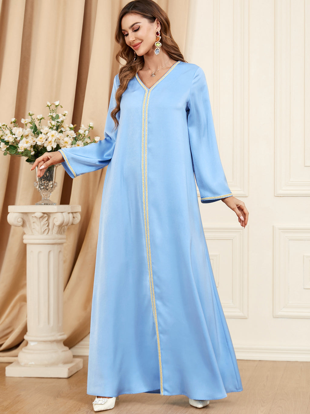 Look beautiful in the Women's Long Sleeve Loose Fitting Maxi Gown. This gown is available in two shades of blue and is accented with elegant golden trim and accents.