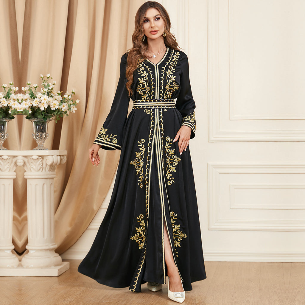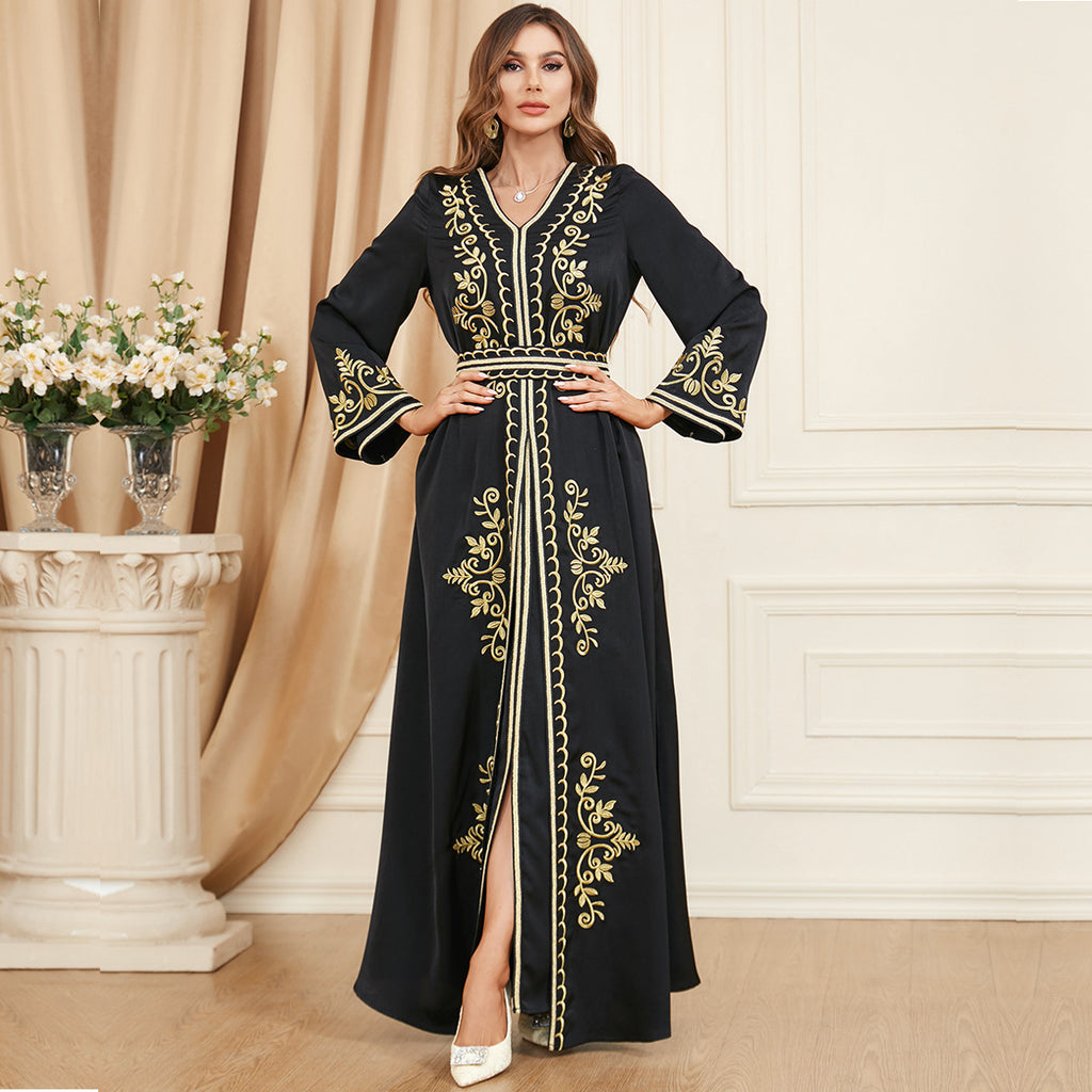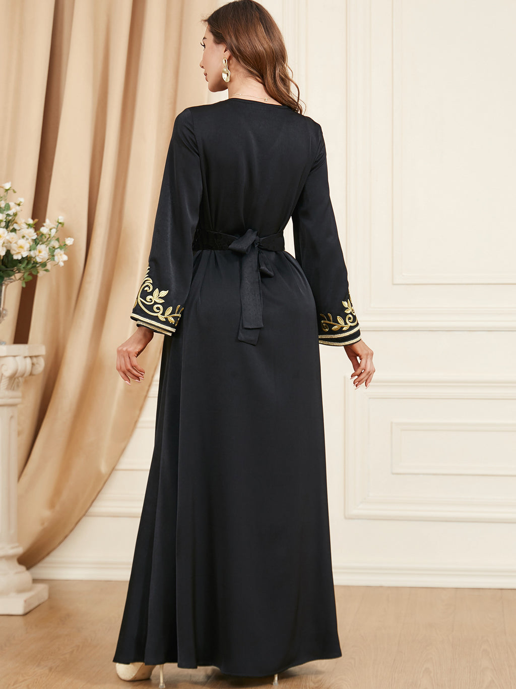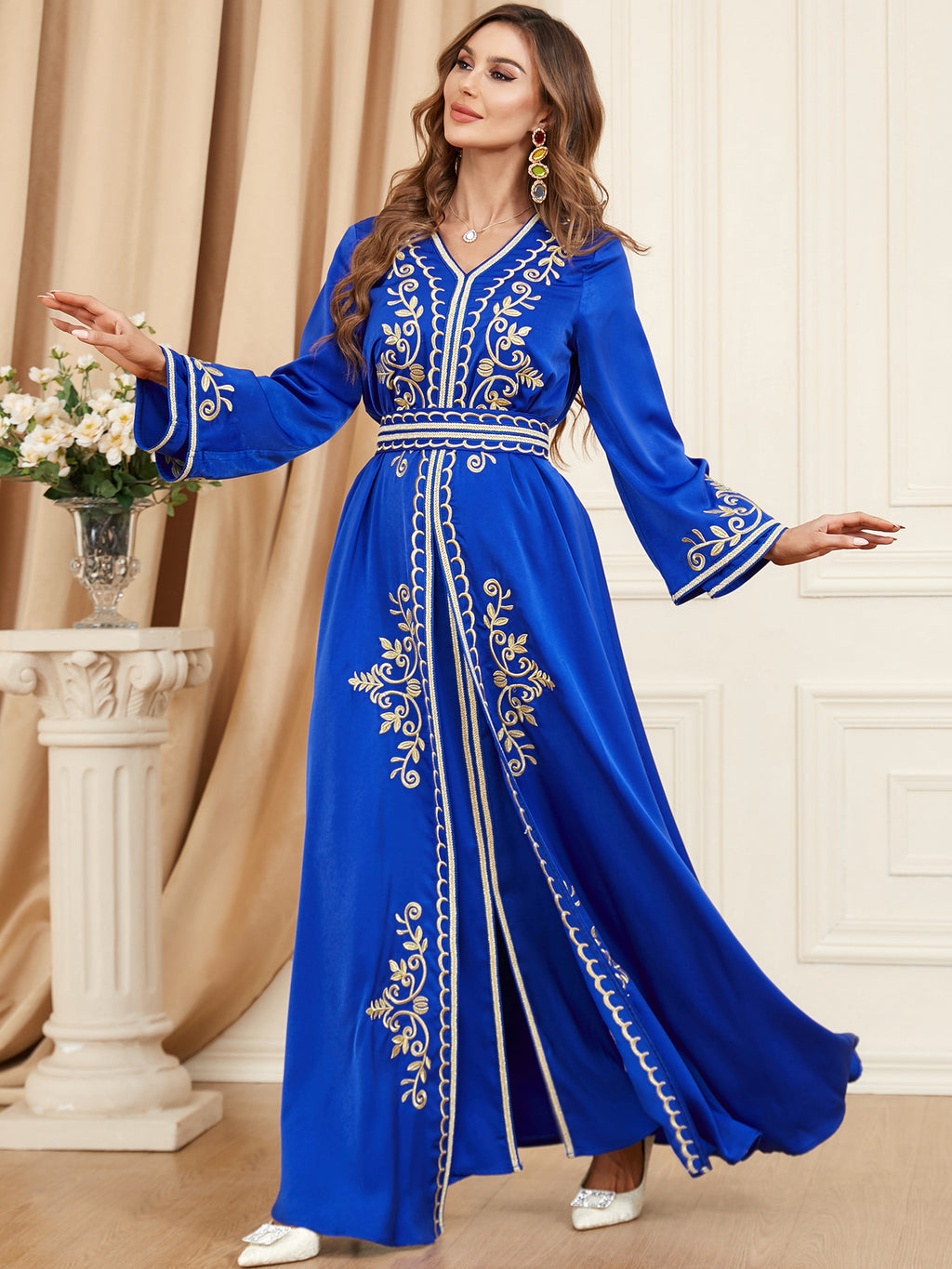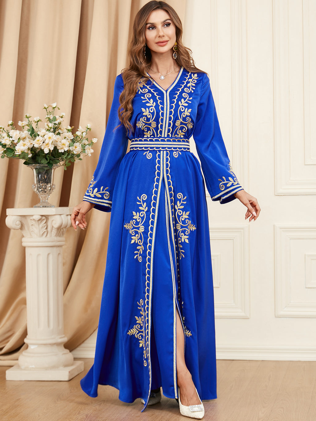 Look beautiful in the Women's Long Sleeve Loose Fitting Maxi Gown. This gown is available in two shades of blue and is accented with elegant golden trim and accents.
