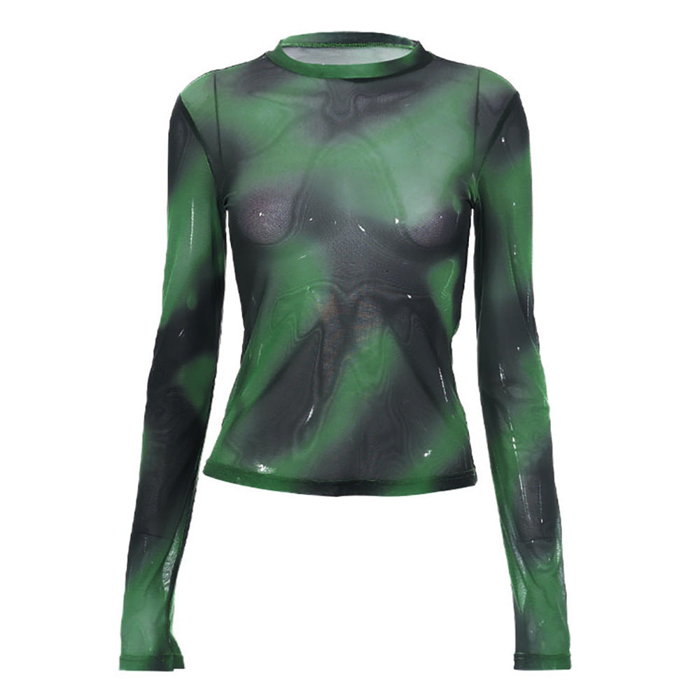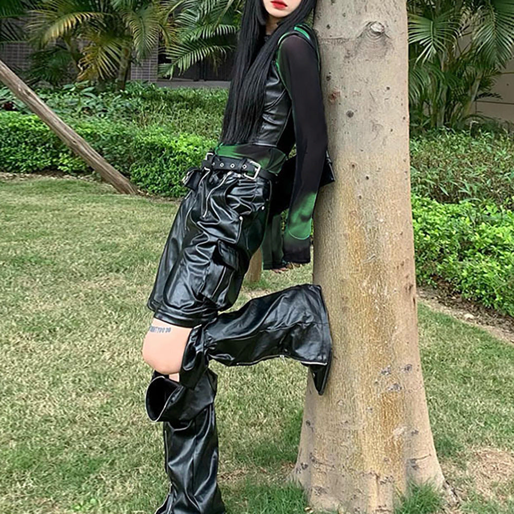 Embrace goth fashion in this Women's Form Fitting Mock Neck Long Sleeve Tee. It features iridescent green and black fabric that adds a unique element to your ensembles.