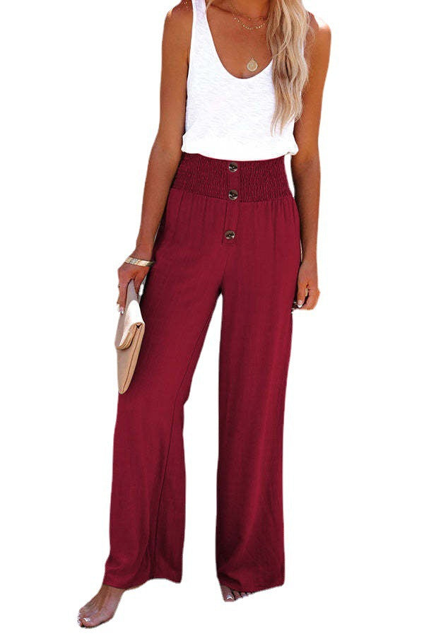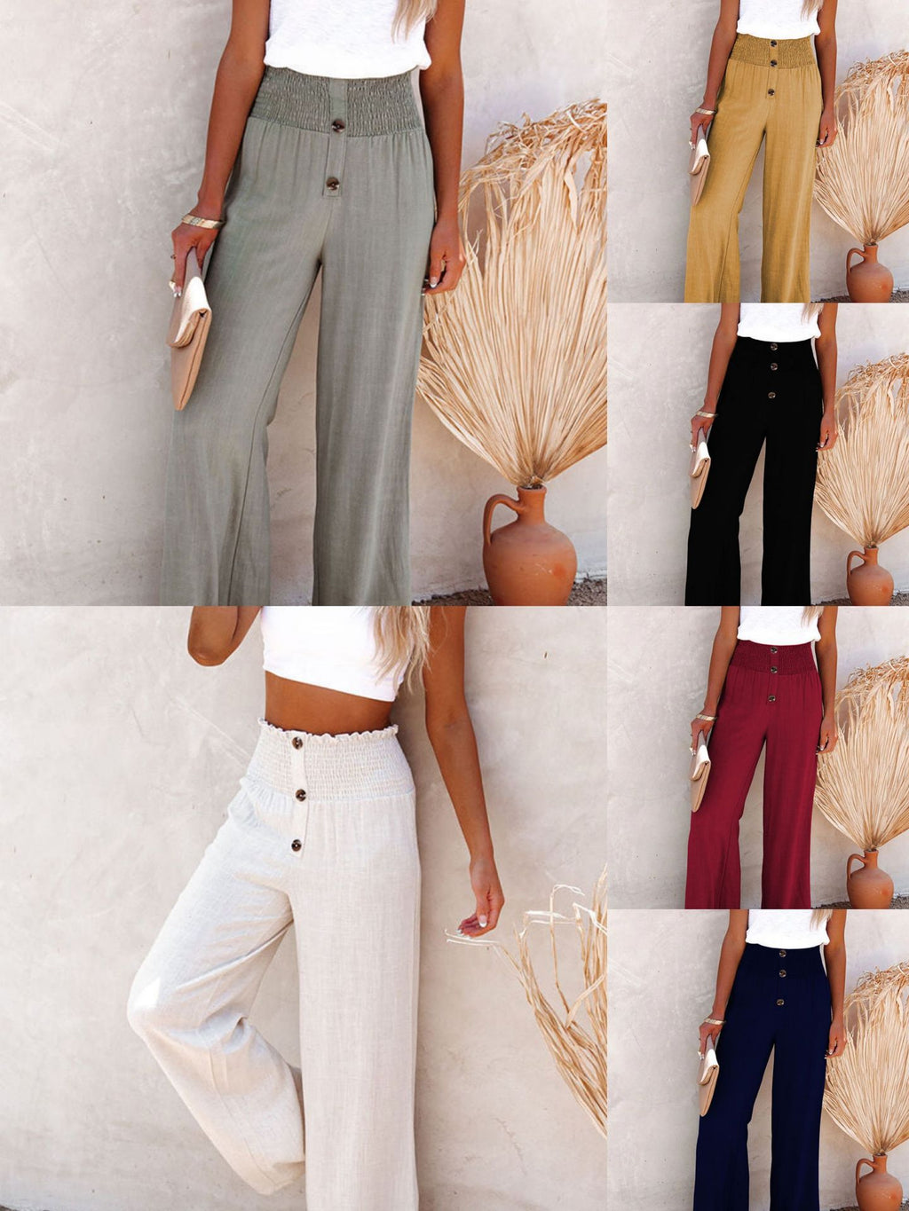 Solleva gli ensemble casuali con l'aggiunta di pantaloni con abbottonatura ad alta vita aderente gamba larga. Questi pantaloni sono caratterizzati dai loro tre pulsanti sul davanti e dalla loro lusinghiera vita.