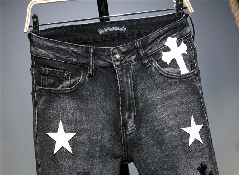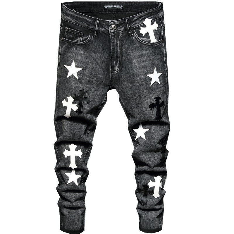 Express your bold personality in the Men’s Slouchy Straight Leg Skinny Jeans that feature a mix of white and black crosses and stars to make yourself stand out.