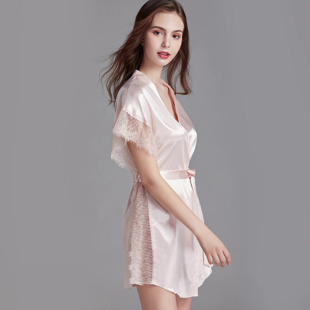 女性用ローブスタイルの半袖ラップナイトガウンには、腰の周りにネクタイが施されており、それを締めて何らかの形を与えます。袖と側面に沿ってレースが特徴です。