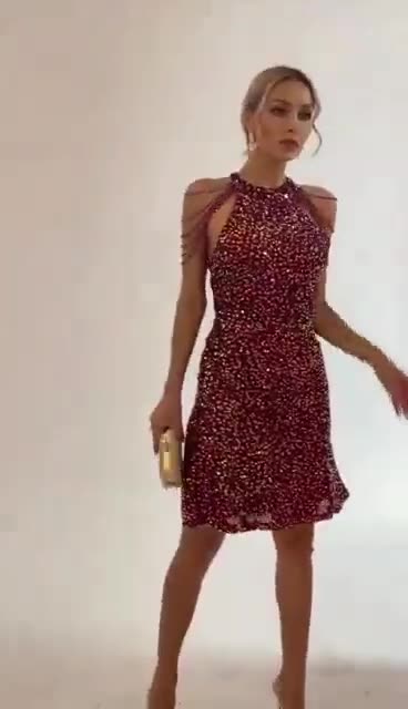 エレガントで洗練されたこの女性のノースリーブのホルターネックスパンコールスパンコールのガウンは、袖に宝石の紐を覆うことを特徴としており、いくつかの素晴らしい色があります。