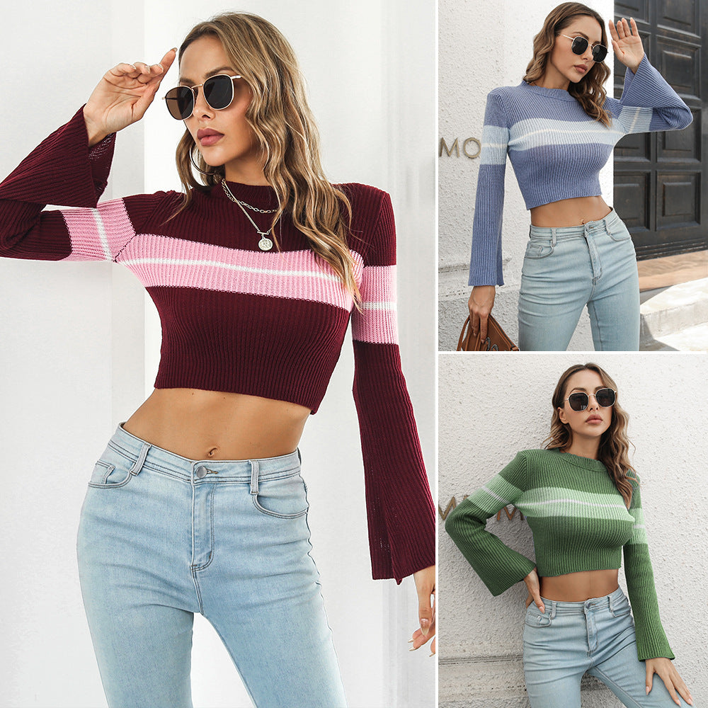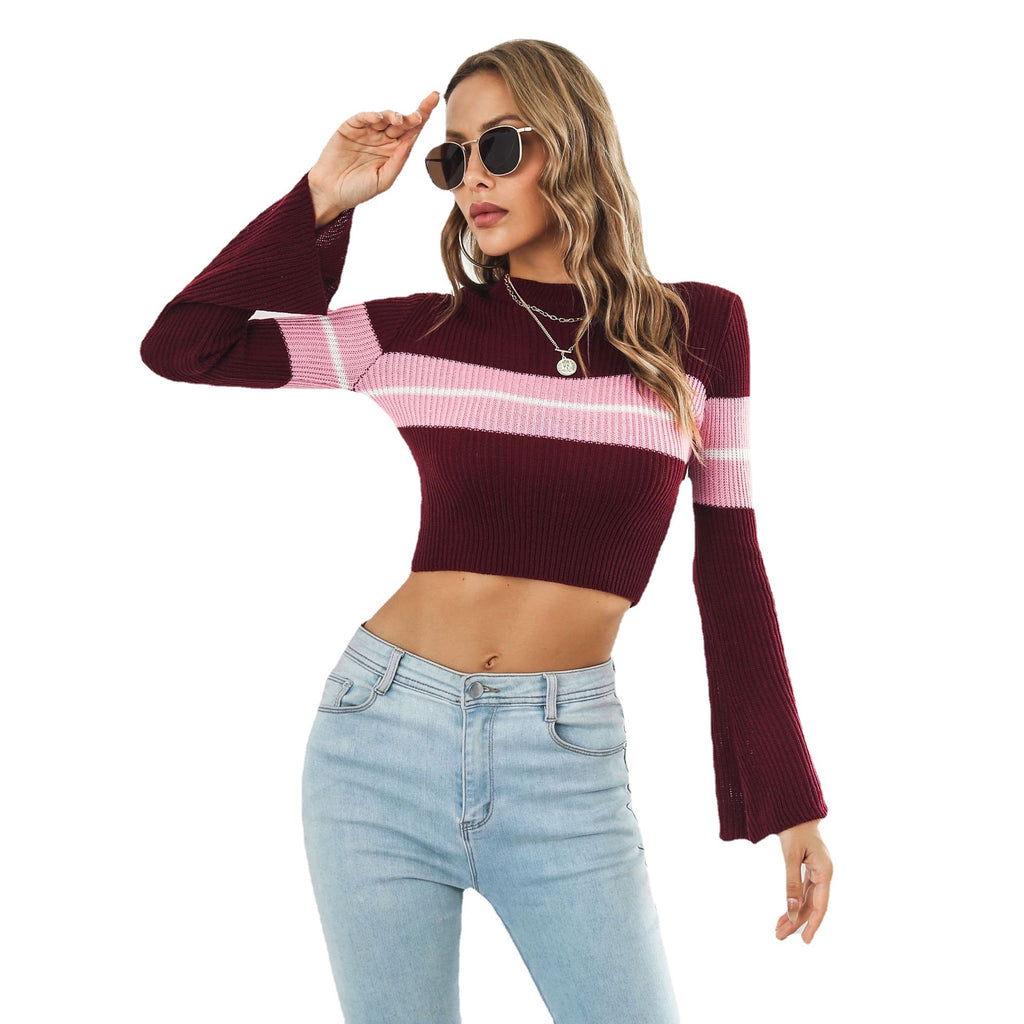 Geniet van je liefde voor retro -stijl wanneer je de bijgesneden trui van de dames draagt ​​met strepen en lange belmouwen. De combinatie van de bijgesneden zoom- en belmouwen geeft het een aantrekkingskracht uit de jaren 70.