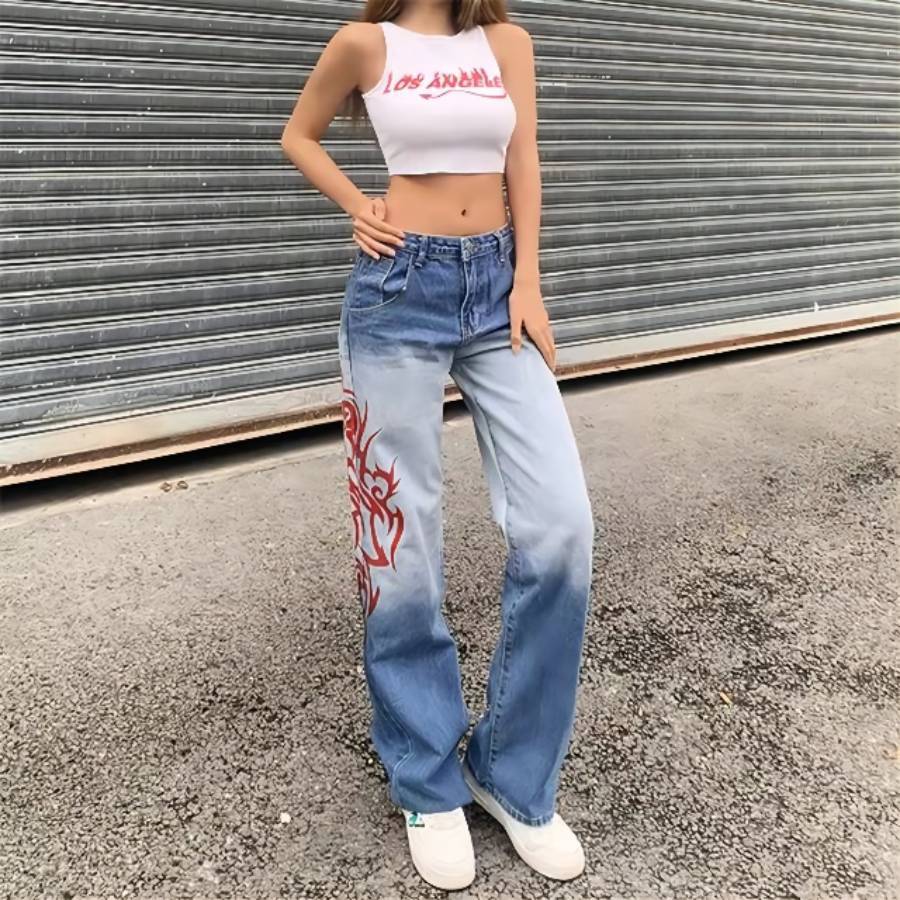 Ontstaat op straat in de spijkerbroek met hoge taille met rode patronen van de vrouwen. Een ingewikkelde rode afbeelding wordt aangetroffen aan de zijkant van één dij om de zure gewassen denim te versieren.
