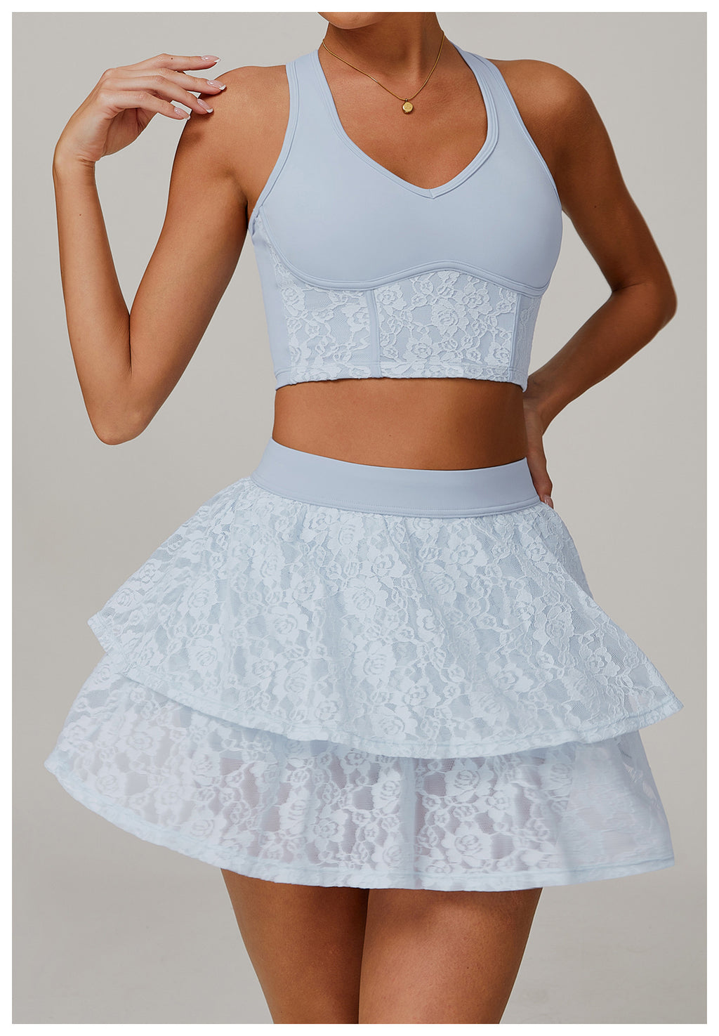Blijf koel en zelfverzekerd in deze mesh kanten yoga -rok. Lichtgewicht en ademend, het biedt bewegingsvrijheid voor trainingen, dans of casual slijtage met een vleugje vrouwelijke stijl.
