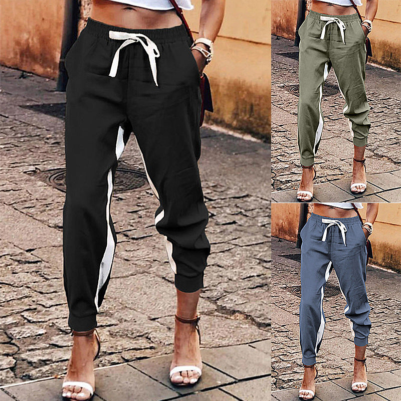 Verbeter uw streetwear -collectie met de dames tailleta capri lengte stedelijke gestreepte broek met een enkellengte en een elastische taille. De taille heeft er een band omheen die u kunt gebruiken om de pasvorm aan te passen.