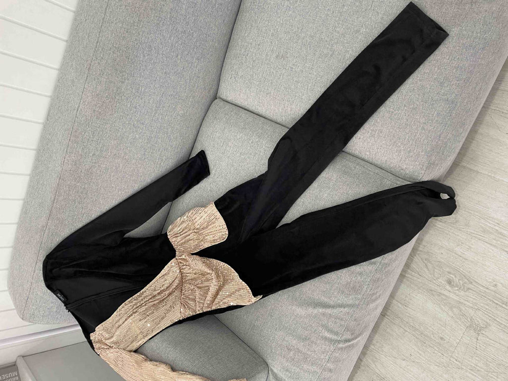 Create a dramatic silhouette wearing the Women's Black and Gold Asymmetrical Body Suit with Skinny Pants. It has a wrapped look that looks like gold and black swirling around each other creating the top and sleeves.