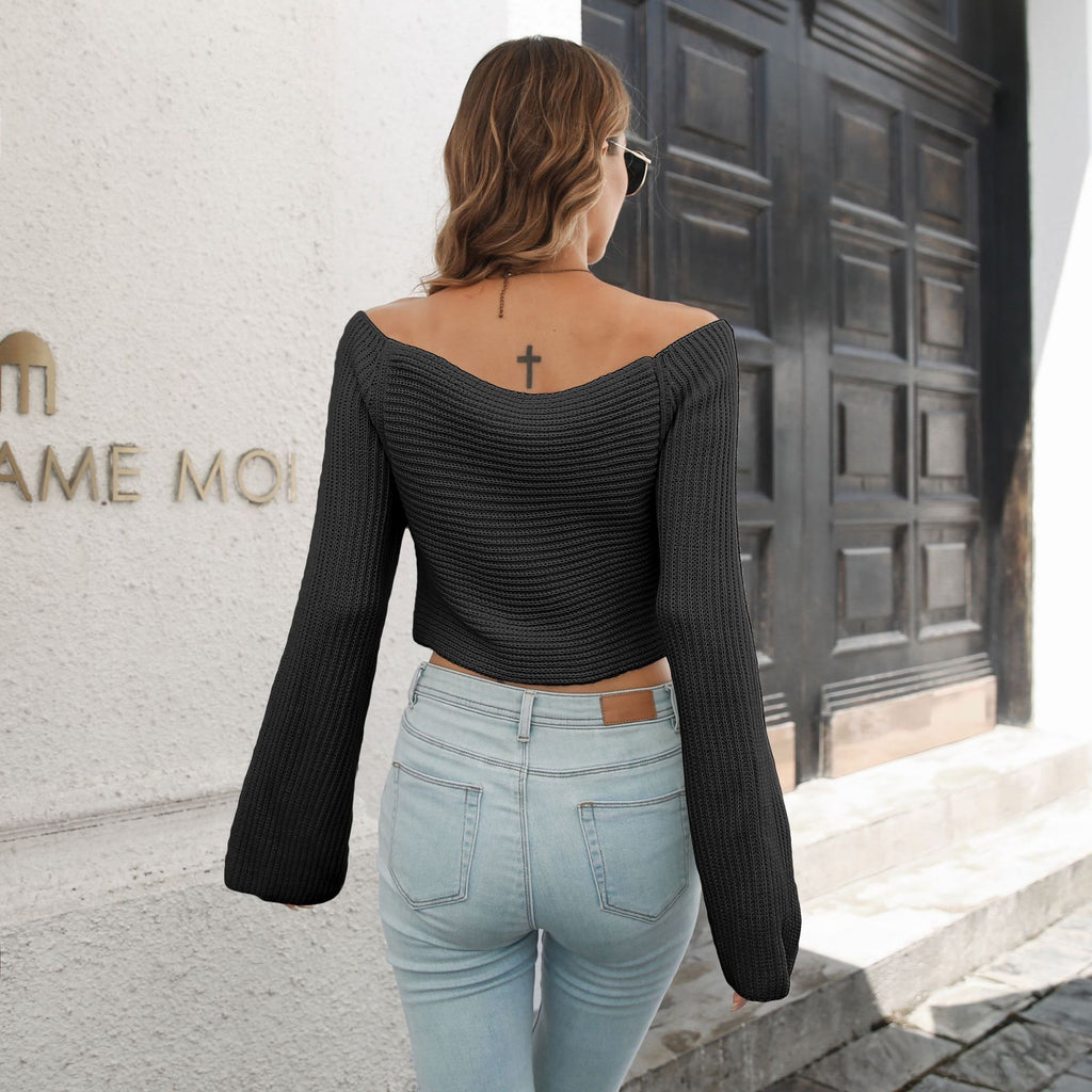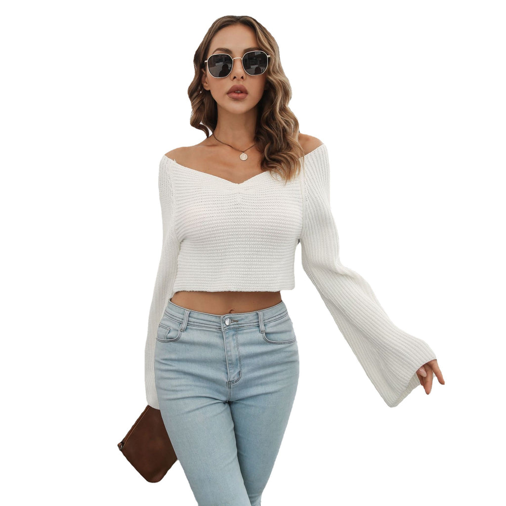 Cropped V-Neck Off Shoulder Bell Sleeved Sweater