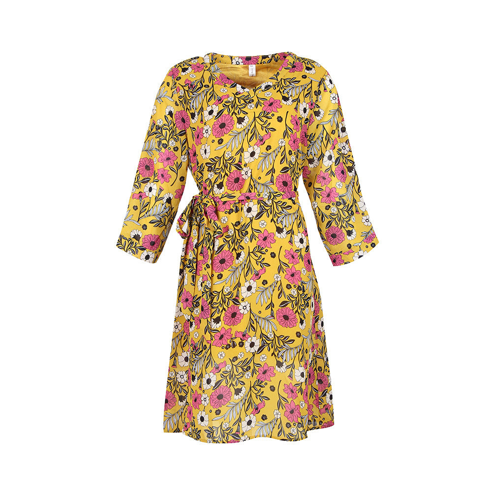 Dress for the summer season with the Women's Midi Dress with Three Quarter Length sleeves. Vibrant yellow fabric with pink floral details gives it a cheerful look.