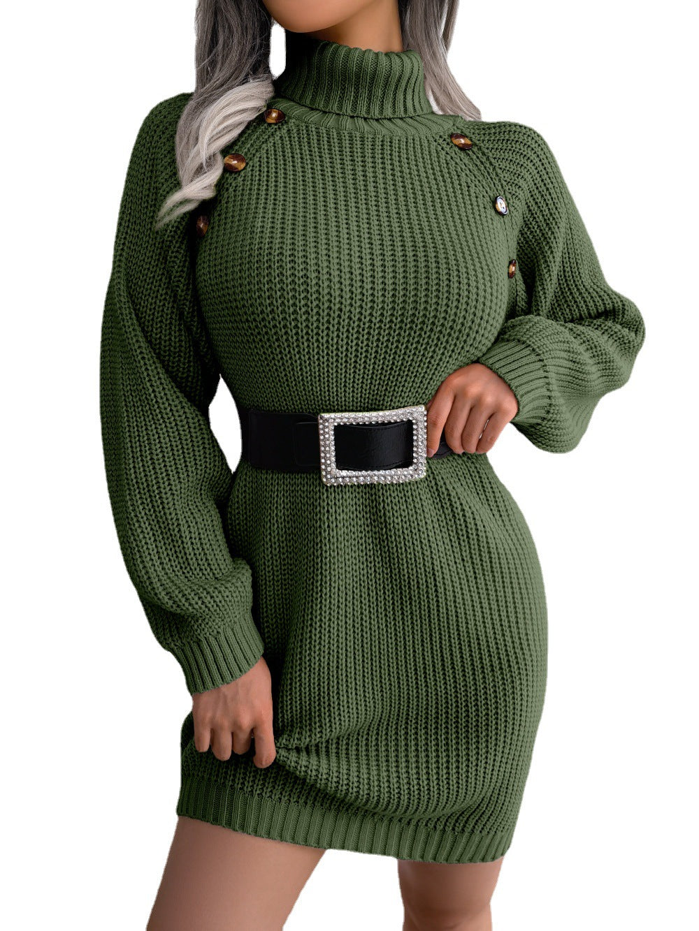 Look your best this winter or fall wearing the Women's Turtleneck Winter Sweater with Button Details. The loose fitting sweater dress features a belt around the waist to give it greater shape.