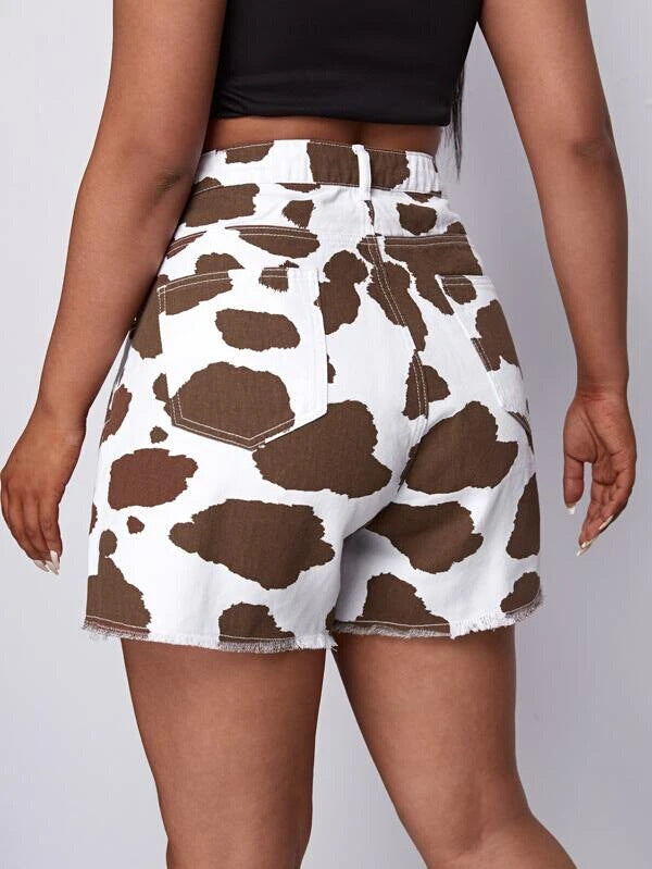 Shorts de cintura alta feminina com designs de impressão de vaca