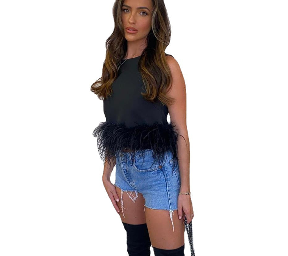 Adicione uma camada de estilo atraente aos seus conjuntos com a tampa do gola O-gola sem mangas da mulher com cintura de penas. As penas são dramáticas, mas finas quando se reúnem ao longo da bainha inferior.
