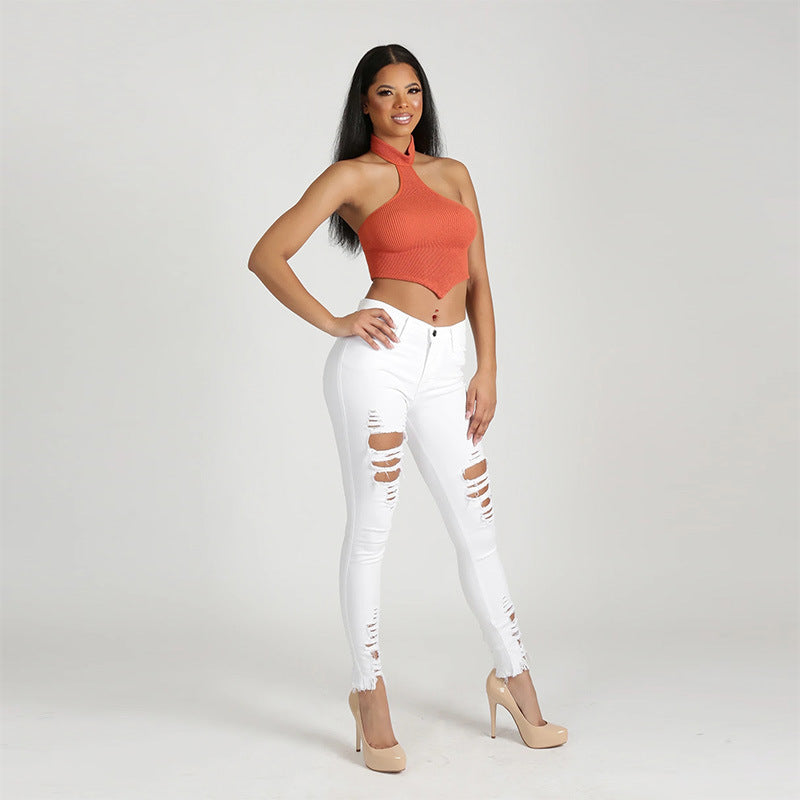 Atualize seu traje de verão com o topo da bainha triangular do pescoço das mulheres. Possui uma textura de malha que é suave ao toque e vem em uma variedade de cores.