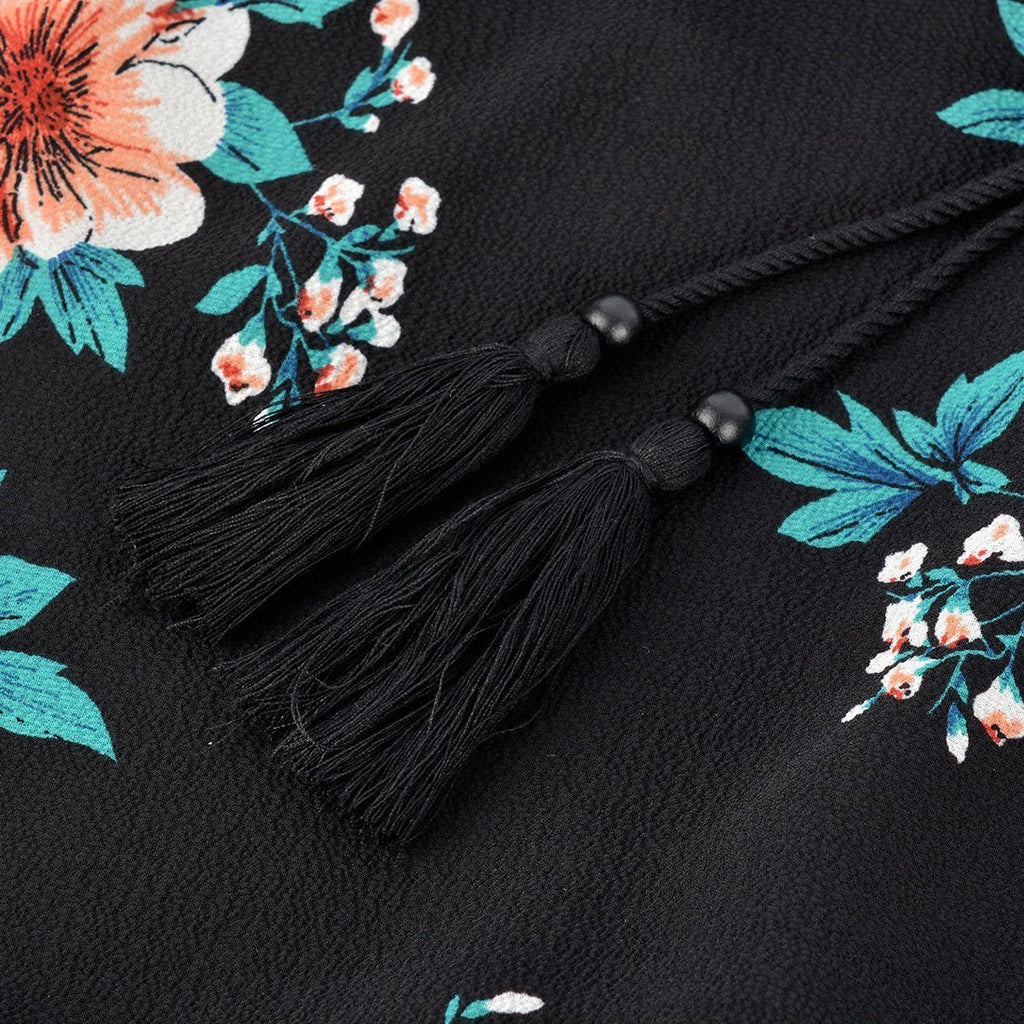 Desfrute de muito talento boêmio nesta primavera ou verão neste casual vestido com estampa floral com estampa floral casual com uma bainha com babados e mangas curtas de babydoll.