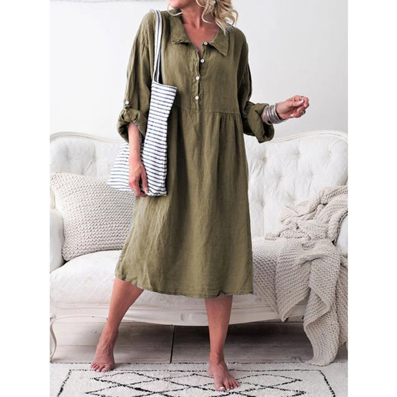 穿著隨意的早午餐,穿著折扣衣領的女裝中衣式的Midi連衣裙打扮。它的按鈕沿著前部延伸,並匹配將肘部上方袖子上方的袖子上方的按鈕匹配。