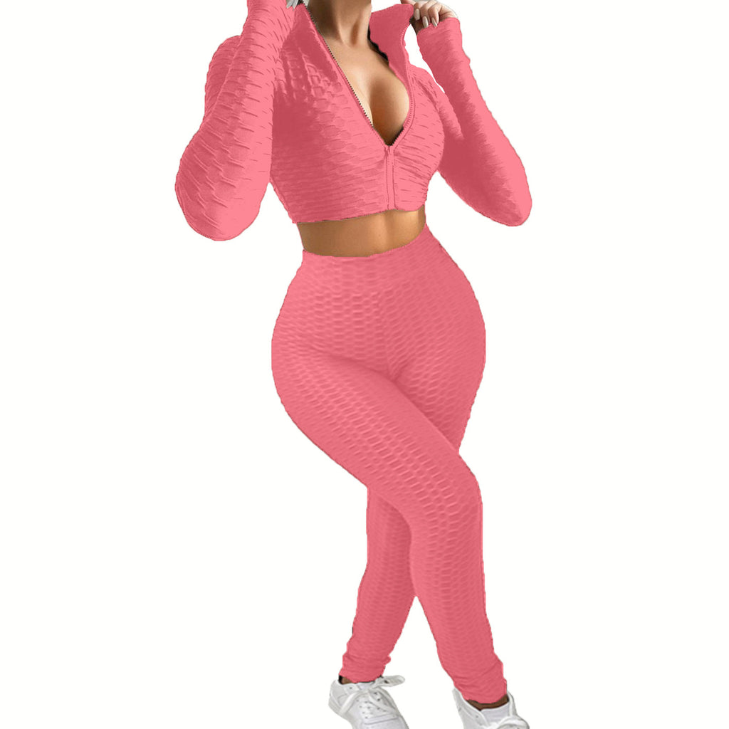 在鍛煉或放鬆身心的同時,穿著女子的兩塊碎作品上衣和綁腿。該設計具有獨特的淨紋理,並具有多種顏色。